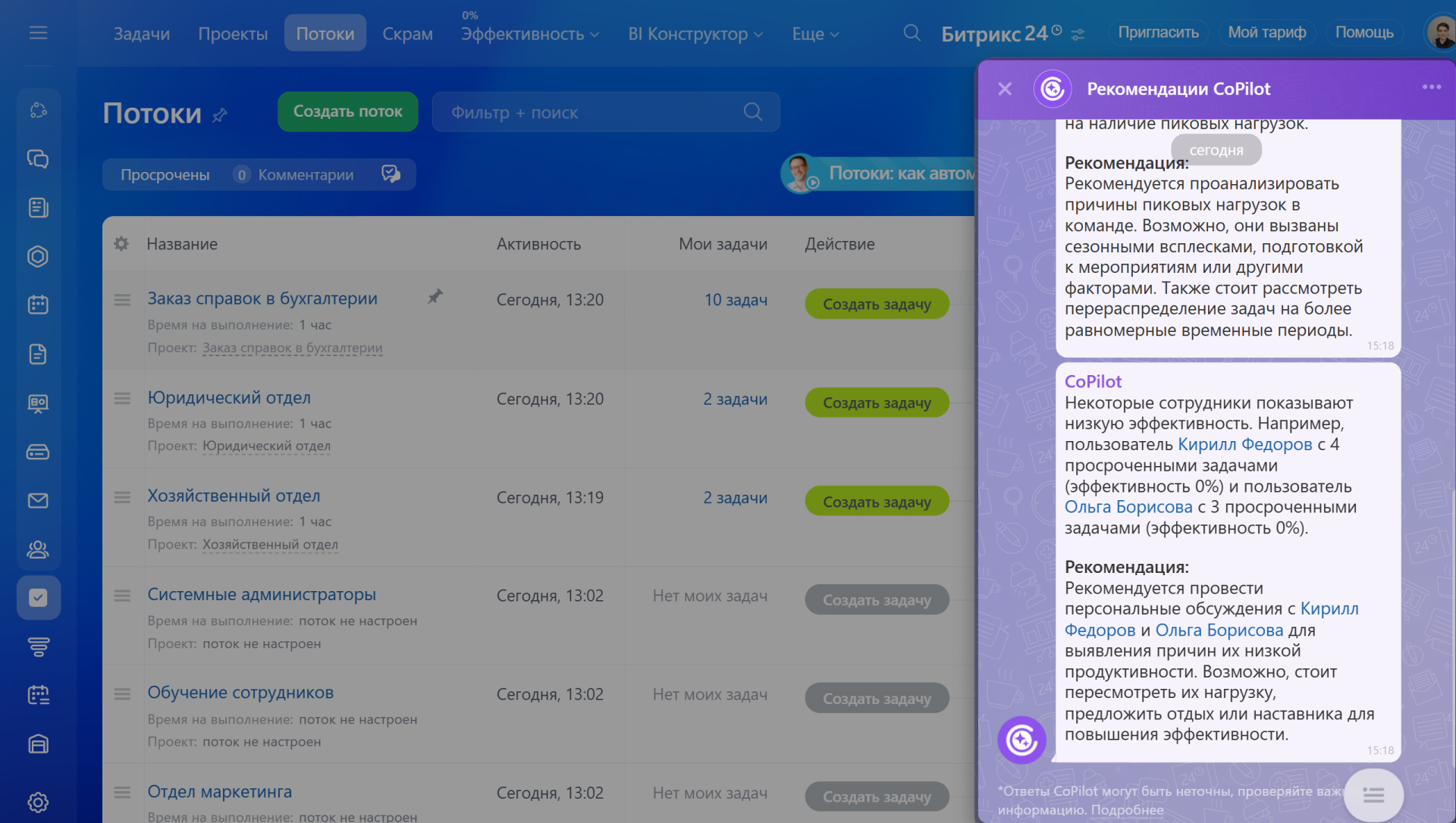 В "Потоках" CoPilot анализирует эффективность: если ниже 80%, даст рекомендации по улучшению. Если высокая — разберет, что сработало. Это инструмент для HR и операционщиков: процессы становятся быстрее и надежнее.